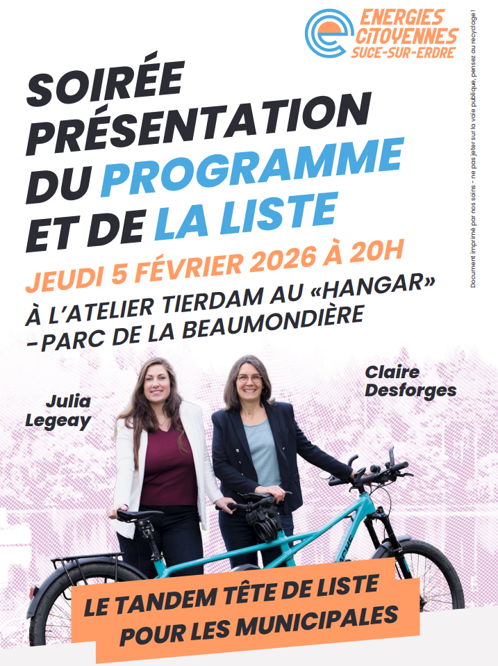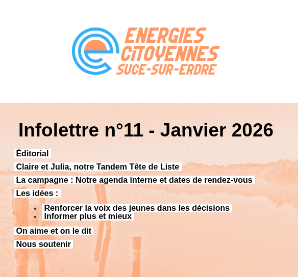Election de nos deux têtes de liste ! Présentation de notre charte à la réunion publique du 15 octobre. Conférence débat avec les Shifters le 12 novembre. Podcast des jeunes sucéens à écouter sur le site. Nous soutenir et rester en contact.